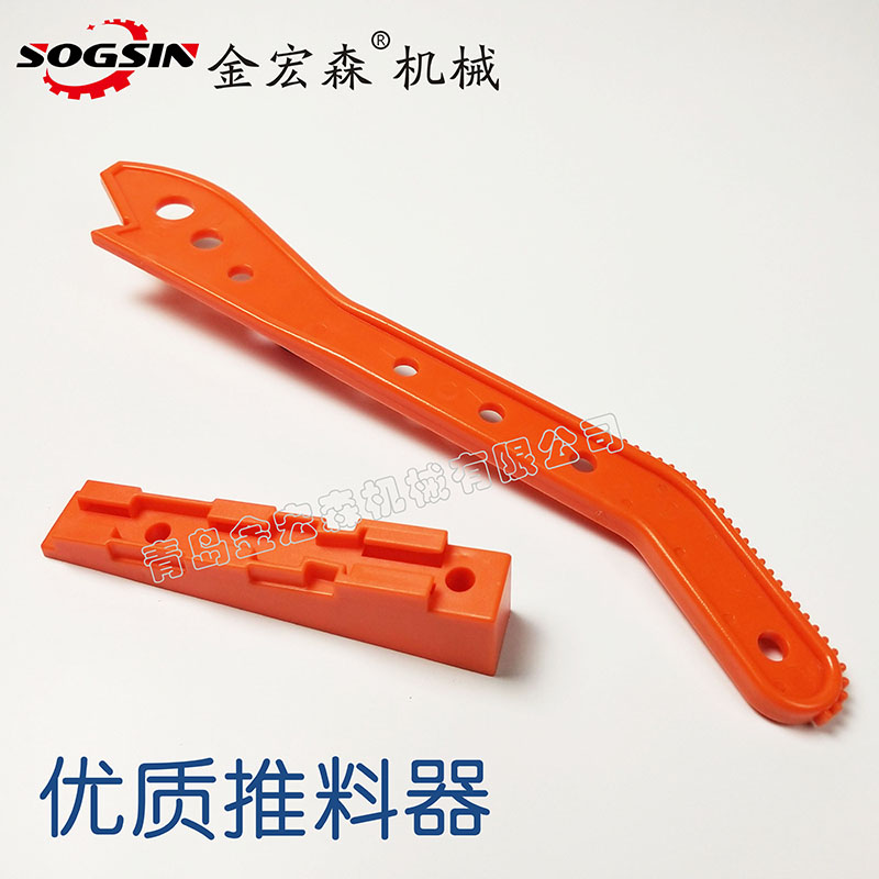 在臺(tái)鋸上(或者在臺(tái)型電刨上)做直切時(shí),推料桿能讓你的雙手遠(yuǎn)離危險(xiǎn)。當(dāng)把一塊很寬的木板直切到寬度小于 4 in(10.16cm)時(shí),推料桿就顯得尤為必要。推料桿有各種不同的形狀,通常是用合成板做的,因?yàn)楹铣砂宀粫?huì)像實(shí)木一樣在不恰當(dāng)?shù)臅r(shí)候裂。我喜歡那種上頭向前延伸出去的推料桿,在操作時(shí),向前推它的同時(shí)保持下壓就可以了。